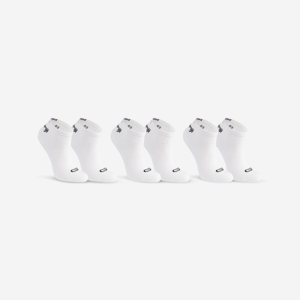 Ce lot de 3 chaussettes tige basse en coton majoritaire accompagne votre enfant pour débuter l'athlétisme à l'école ou en club. Elles assurent stabilité et respirabilité pour courir, sauter ou lancer.