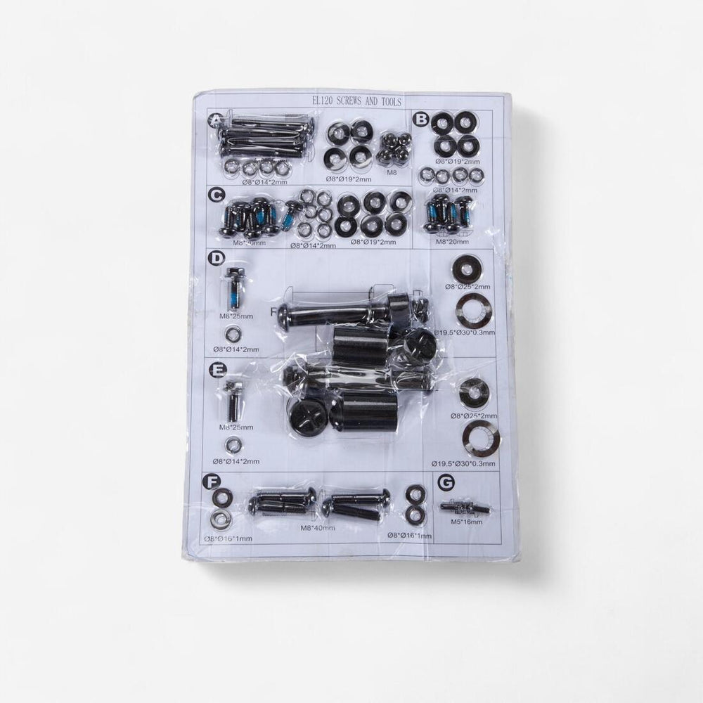 Ce kit de visserie regroupe toutes les vis et les outils nécessaires au montage, au dépannage ou au remplacement des pièces de votre vélo elliptique EL120 pour un assemblage facilité.