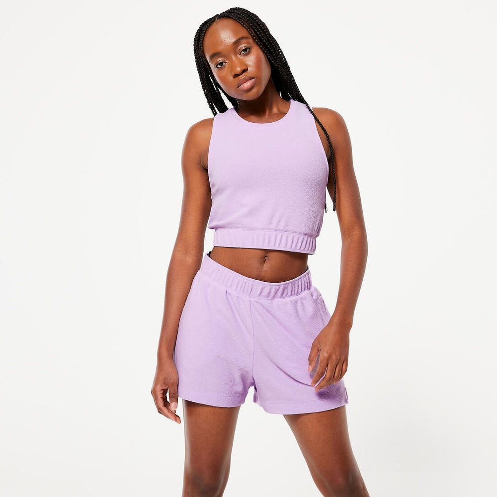 C'est le débardeur frais dans tous les sens du terme : il est agréable à porter même quand il fait chaud et il apporte de la nouveauté dans votre dressing. Croppé au-dessus du nombril, il est resserré par une bande élastique sur le bas pour un style impeccable. Et bien sûr, son tissu éponge lui donne un côté vintage hyper tendance ! À porter sans hésiter avec notre short éponge pour le total look.