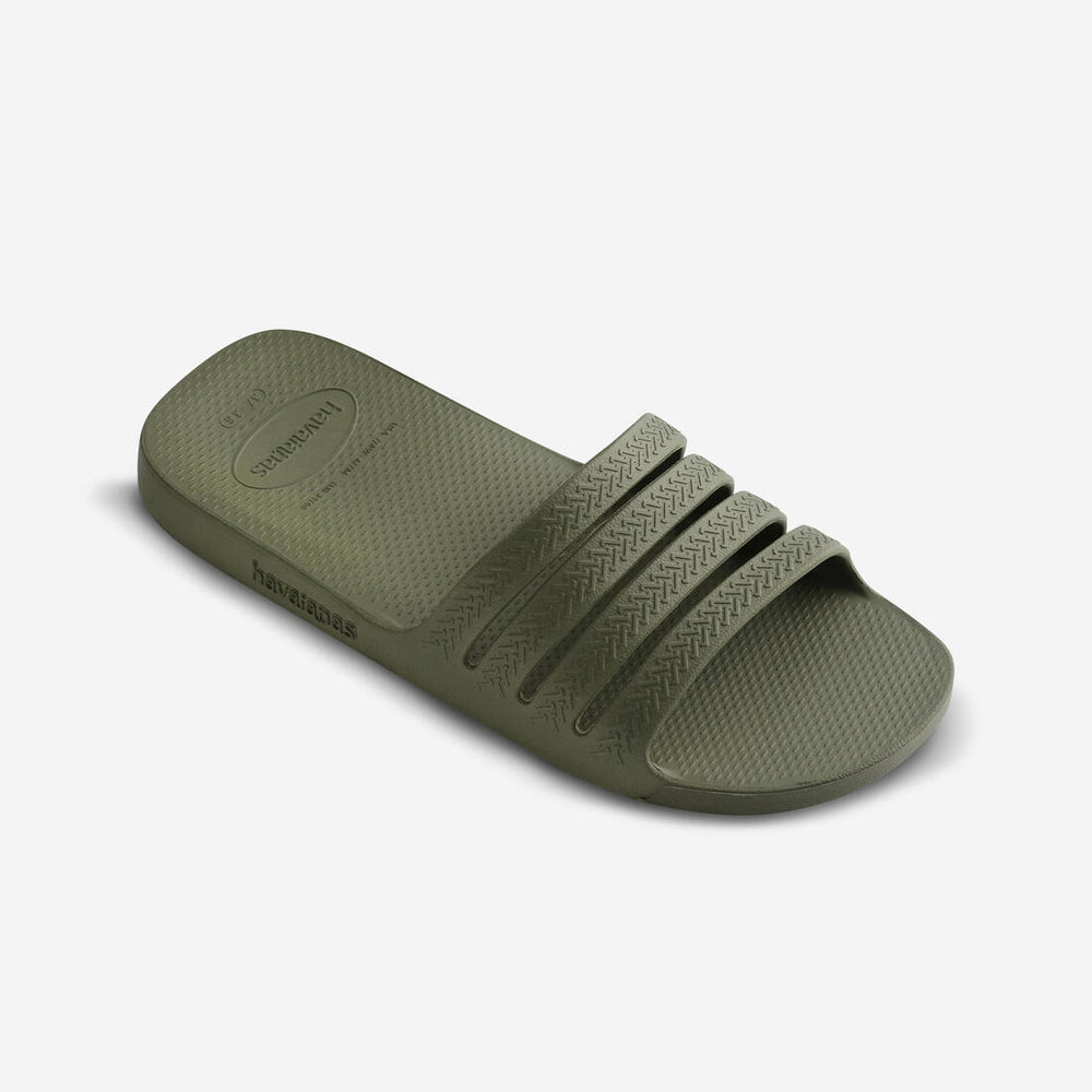 Sandales Havaianas avec 4 lanières horizontales à motifs gaufrés qui s'enroulent autour des pieds. Confortables, solides, légères, résistantes à la chaleur et à l'eau, et antidérapantes.