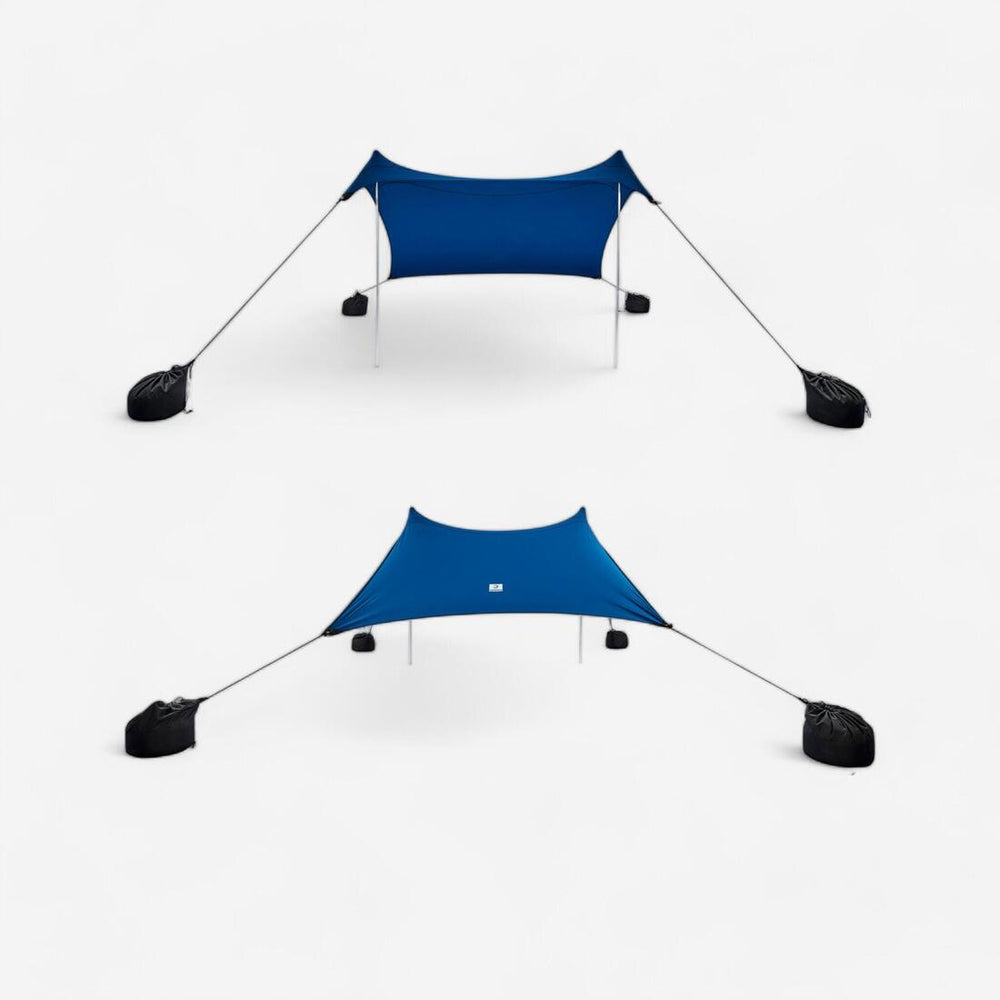 Abris de plage suffisamment grand pour 4 adultes. Se fixe sans sardines grâce à ses 2 mats en aluminium et ses 4 sacs de lestage à remplir de sable pour tendre la structure.