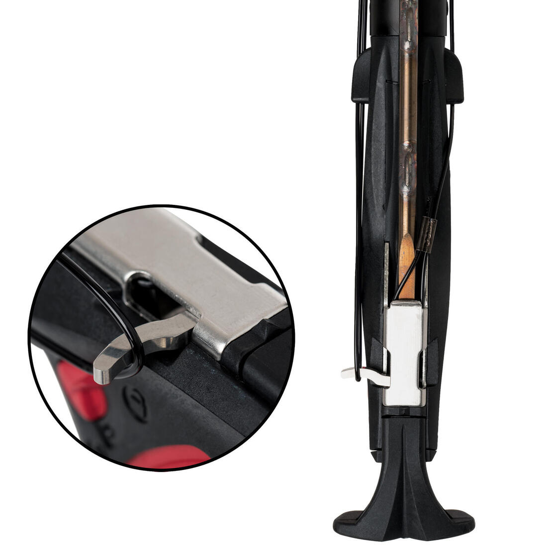 Prise en élastomère antidérapant est confortable pour une préhension optimale et une inclinaison adéquate pour un alignement bras fusil naturel. La crosse est en techno-polymères renforcé en fibres et billes de verre et la garde en inox 316L. Mécanisme tout inox 316L avec largue fil réversible et cassette inox. Peut accueillir des flèches de 7mm avec du fil de 2mm
