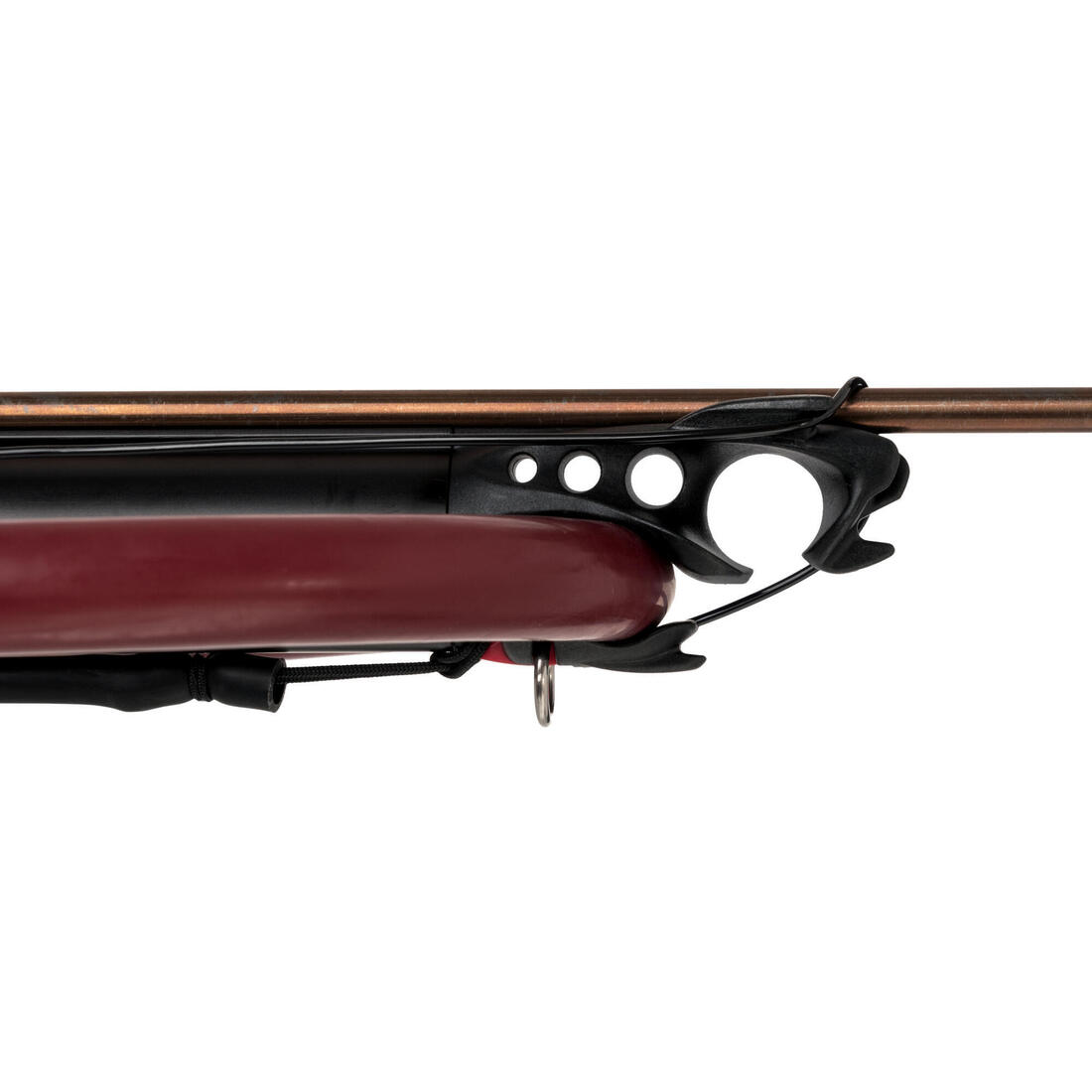 Prise en élastomère antidérapant est confortable pour une préhension optimale et une inclinaison adéquate pour un alignement bras fusil naturel. La crosse est en techno-polymères renforcé en fibres et billes de verre et la garde en inox 316L. Nouveau mécanisme tout inox 316L avec largue fil réversible et cassette inox. Peut accueillir des flèches de 7mm avec du fil de 2mm