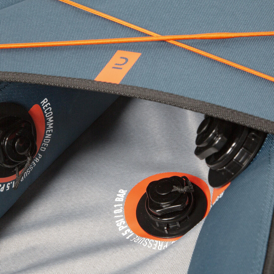 Gonfler en premier le fond, puis un boudin, puis le second boudin à 50%. Vérifier le positionnement des chambres. Puis gonfler le tout à 100% a une pression maximum de 0,1 bar (1,5 PSI). NE PAS SURGONFLER! Bien refermer les valves. Installer les 3 dérives, sauf en usage rivière s'il y a peu d'eau. En cas de FORTE CHALEUR, dégonfler un peu le kayak hors de l'eau pour éviter les surpressions qui peuvent endommager le kayak. Ne pas laisser gonflé en plein soleil : risque de surpression