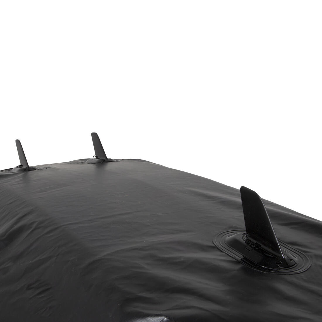 Sac de transport type sac à dos pour déplacements courts. Ailerons à clips faciles. Dégonfler le kayak en dévissant les 3 valves "boston". Rabattre les boudins latéraux sur le fond. Rouler en démarrant du côté opposé aux valves pour chasser l'air. Placer le kayak roulé dans le volume principal du sac. Fermer le zip et serrer grâce à la sangle de compression.