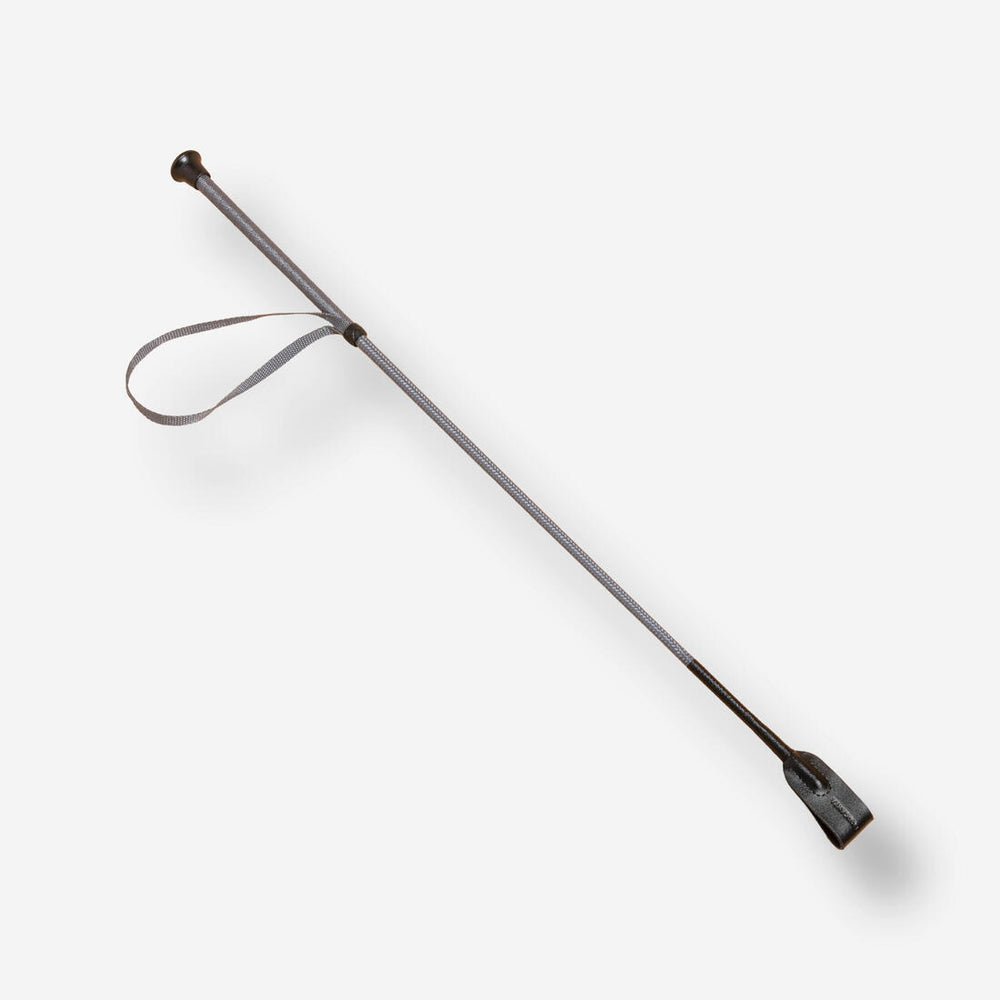 Cravache avec butée et dragonne fixe pour compenser l'absence de poignée.