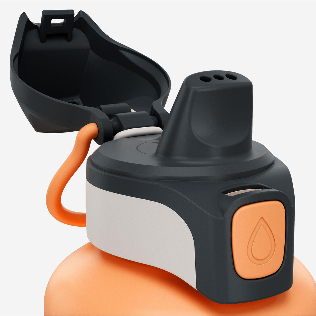 Le bouchon instantané est simple d'utilisation, il s'ouvre à une main grâce à son bouton ergonomique. La gourde ne fuit pas la tête en bas quand le capot du bouchon est ouvert.