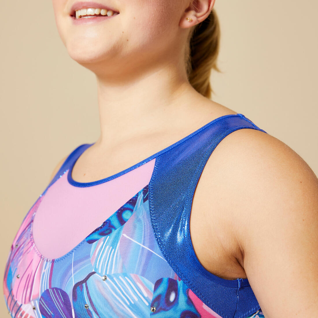 Un justaucorps sans manches, sublimé de strass et de voile, pour la pratique de la gymnastique artistique. Adapté aux gymnastes de tout niveaux, qui recherchent aisance et confort.