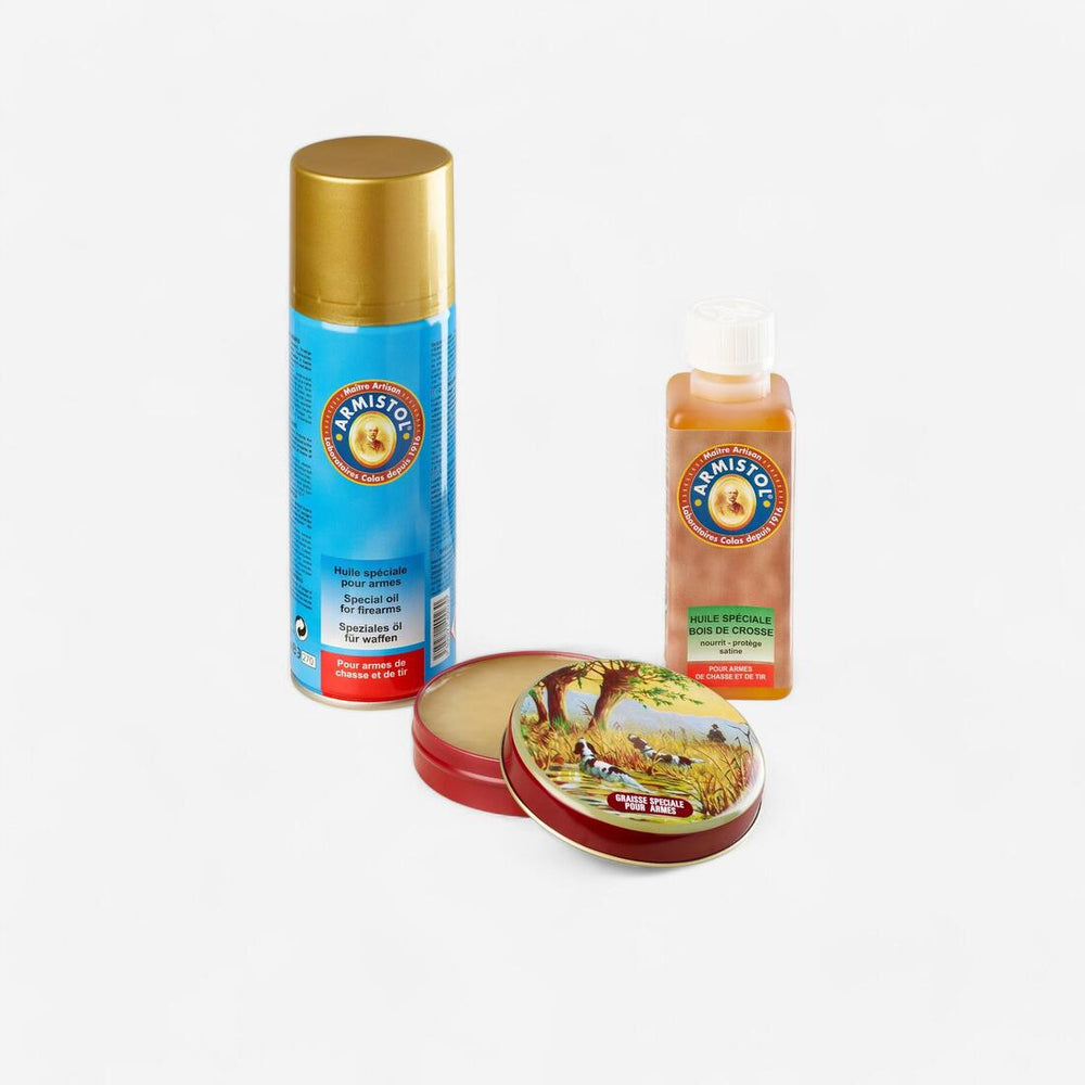 Conçu pour l'entretien des armes de tir sportif et de chasse, ce kit se compose d'une huile aérosol, d'une huile pour l'entretien des bois et d'une graisse.
