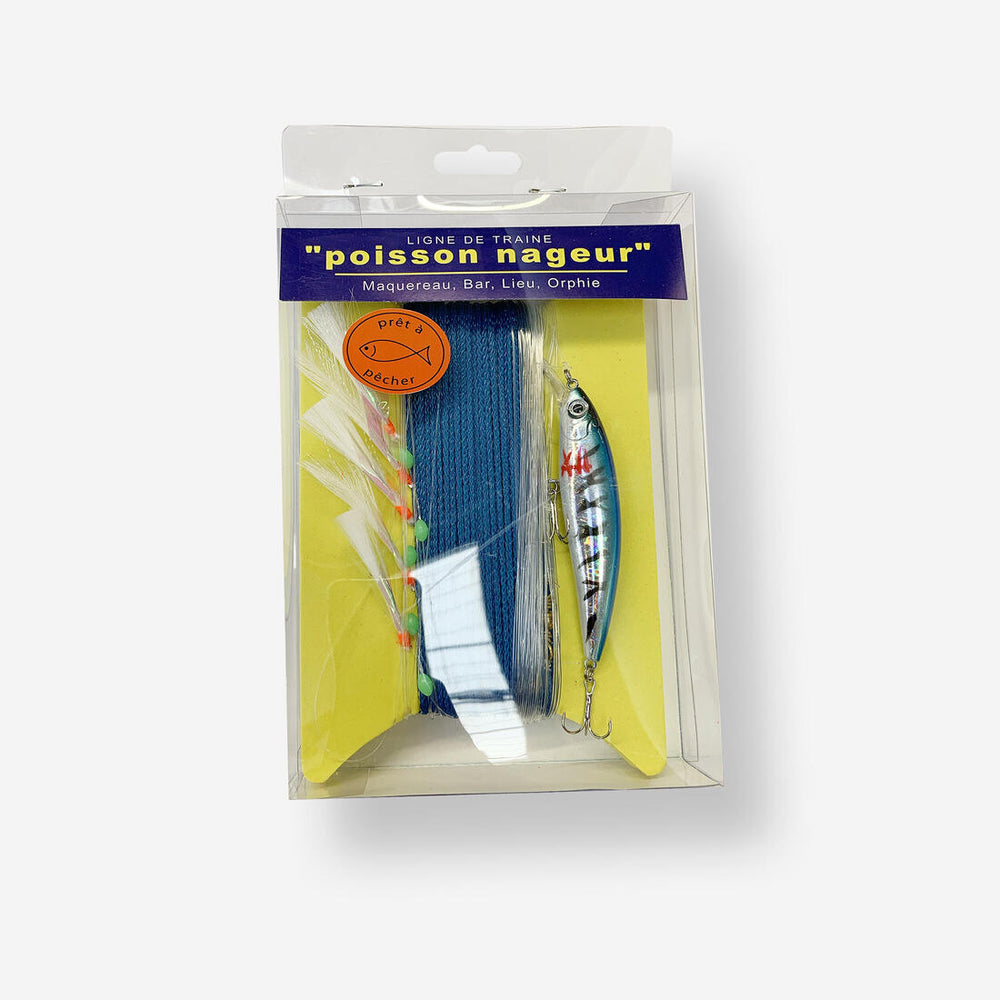 Ligne de traîne montée avec train de plume et poisson nageur. Polyvalent et efficace sur de nombreuses espèces marines (bars, maquereau, bonites...).
