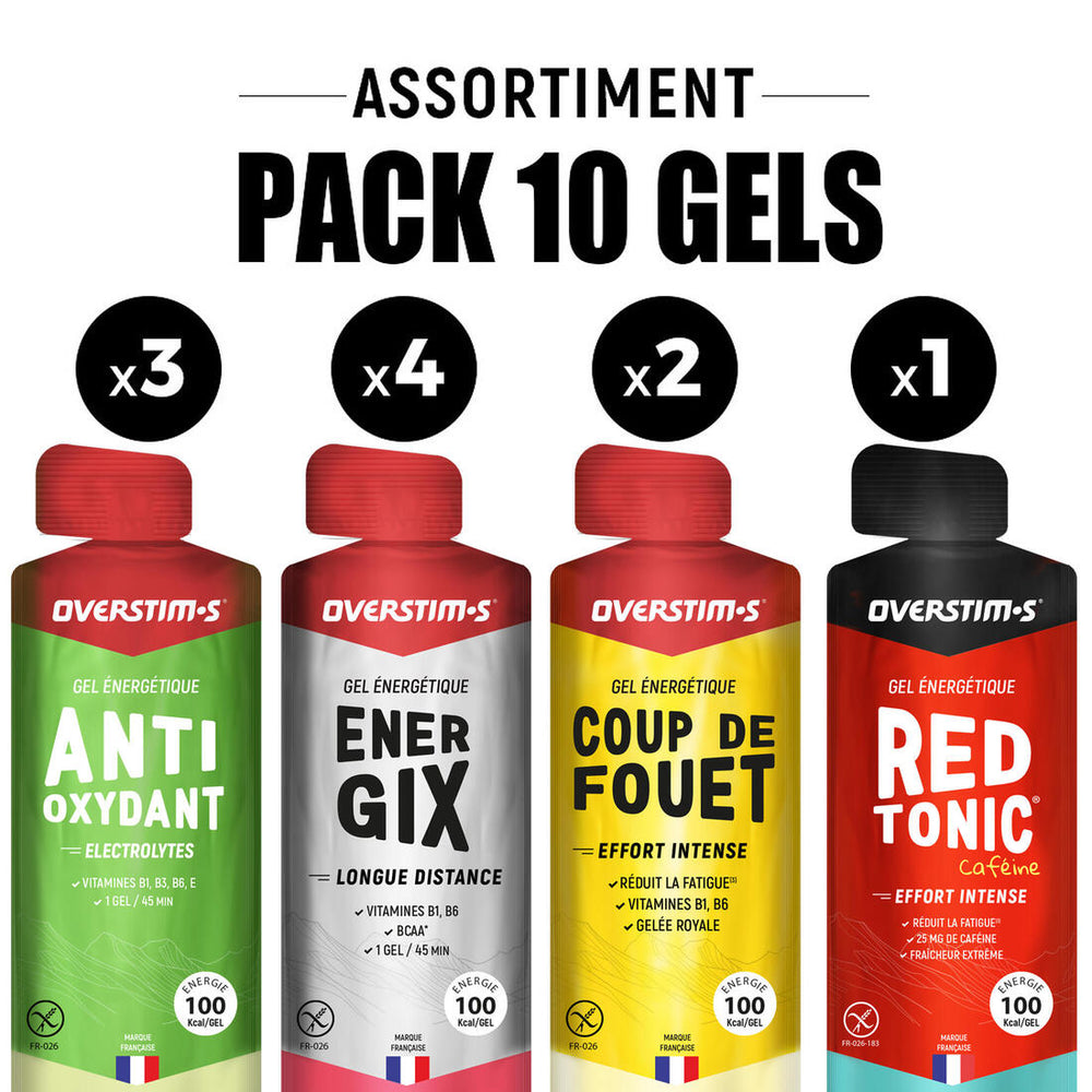Pour une énergie adaptée à votre épreuve, aux conditions et aux moments d'effort, OVERSTIM.s a réuni dans un pack 10 gels énergétiques pour une efficacité maximale