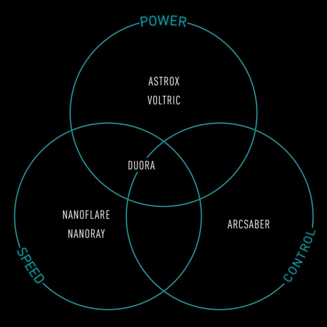 Raquette axée contrôle avec ARCSABER (remplaçante de la gamme DUORA) pour répondre aux exigences d'un jeu polyvalent et précis. Elles ont un équilibre plus ou moins neutre pour garder un maximum de contrôle et de sensation.