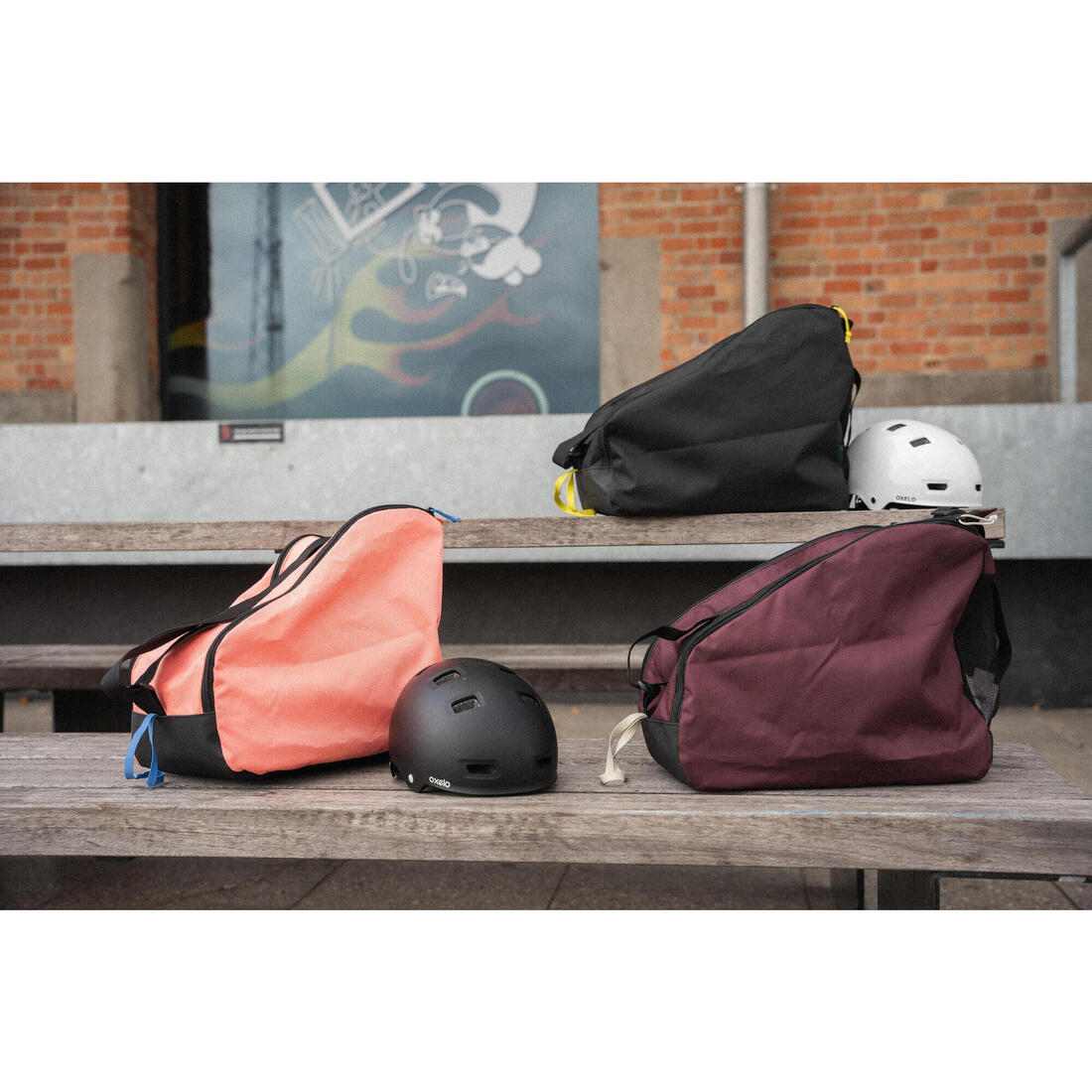 Idéal pour ranger les rollers jusqu'à la taille 42, et ses équipements de protections. Forme triangle arrondi. Dimensions: longueur: 40cm, largeur: 20cm, hauteur: 35cm au point le plus haut.