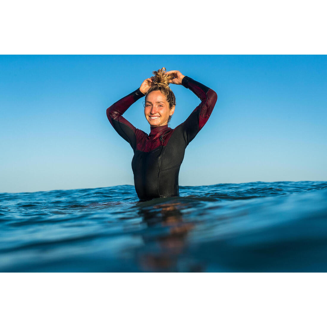 La finition du col a été étudiée pour limiter les irritations. En fonction de la sensibilité de chacune, il est possible de porter un top UV sous la combinaison pour limiter le risque d'irritations. L'application de crème grasse (ex. vaseline) dans les zones de frottements (cou, aisselles, genoux) est également préconisée en cas d'utilisation longue. Au 1er essayage, on peut se sentir serrée au niveau du col mais cette zone va se détendre une fois dans l'eau.