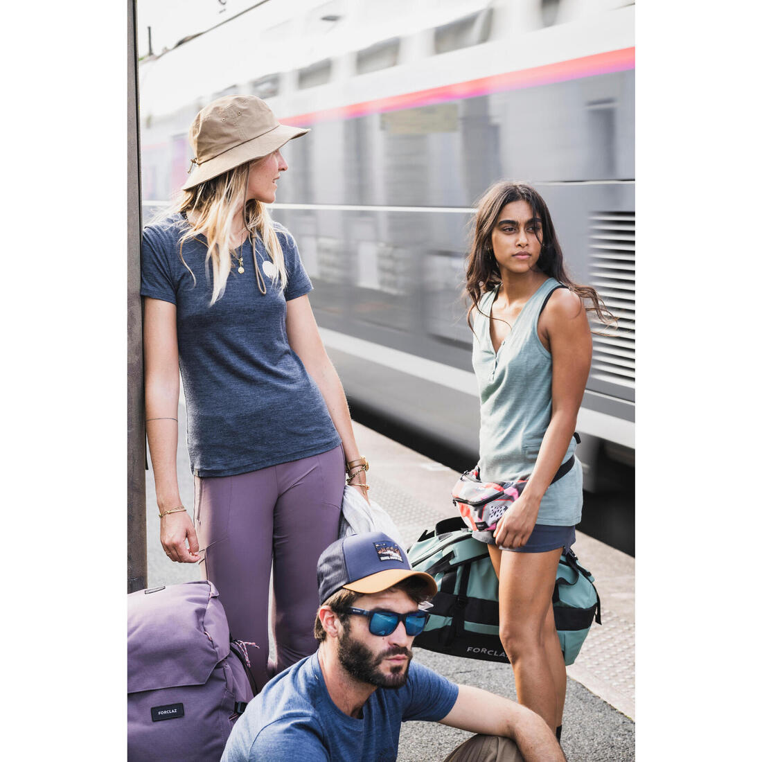T-shirt de trek voyage - manches courtes - laine mérinos TRAVEL 100 bleu Femme