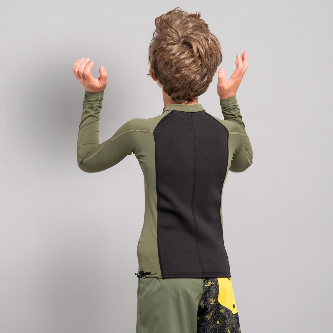 Top solaire manche longue avec du néoprène sur le ventre et le dos pour protéger les juniors du soleil, même dans l'eau, et limiter les irritations au contact de la planche.
