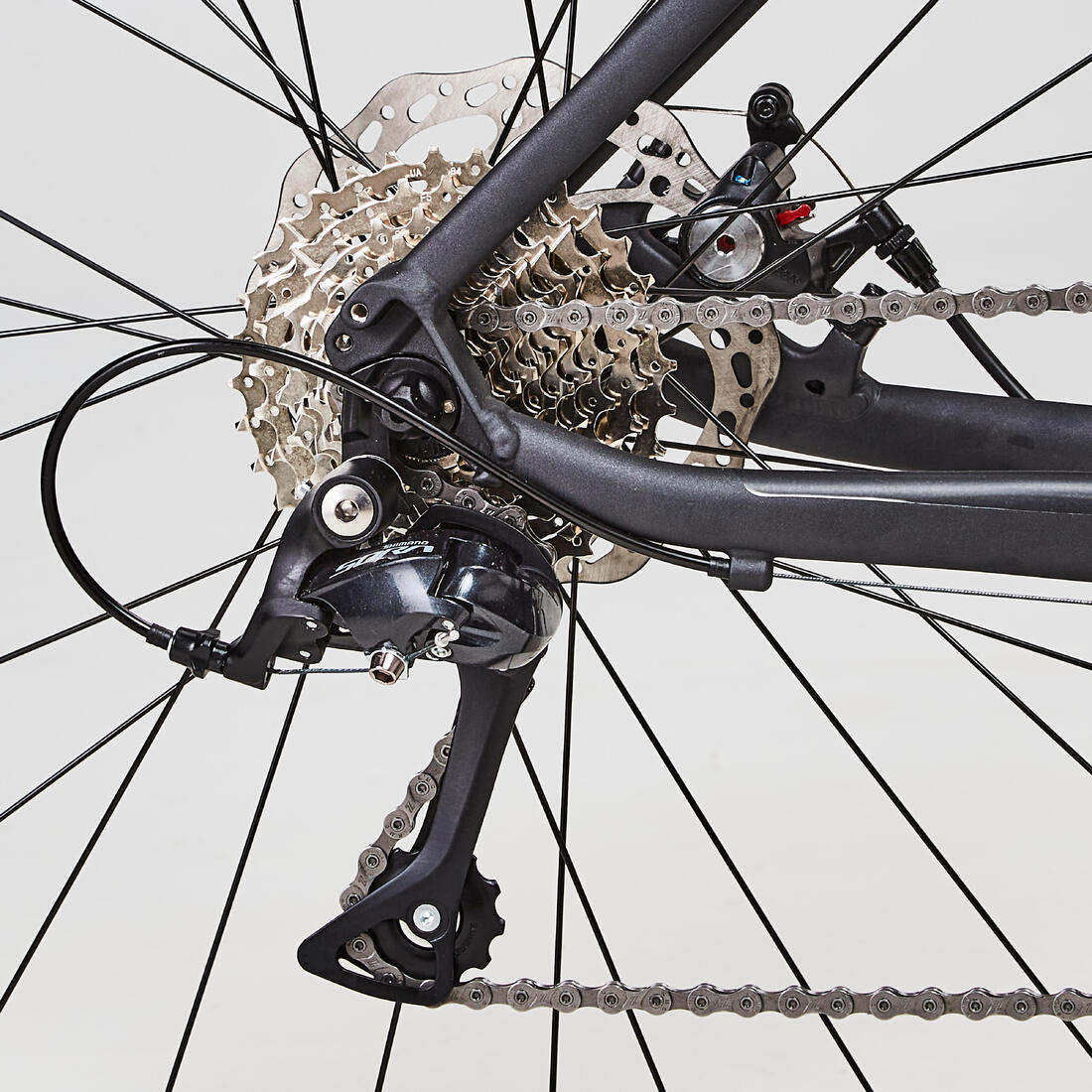 Cassette MICROSHIFT CS-H092 9V 11/32 (11/13/15/17/19/21/24/28/32). Pédalier SHIMANO SORA 50/34. Longueurs des manivelles différentes en fonction de la taille du vélo : XS, S : 170 mm. M, L, XL : 175 mm.