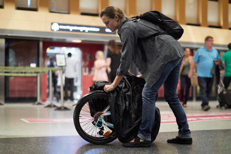 Rangez votre housse dans son sac de transport accroché à votre vélo pliant.