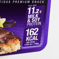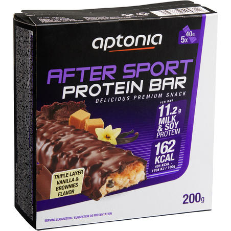 Barre, tricouche. Riche en protéines, arôme vanille, caramel, enrobée au chocolat noir. Ingrédients : Chocolat noir 25 % (pâte de cacao, sucre, BEURRE* de cacao, matière grasse de LAIT* anhydre, émulsifiant : lécithine de SOJA*, arôme naturel de vanille), sirop de glucose-fructose, protéines de LAIT*, caramel 10,5 % (LAIT* concentré sucré (LAIT* concentré, sucre), sirop de glucose, huiles de palme et de colza, sucre, sirop caramélisé, émulsifiant : mono- et diglycérides dacides gras, sel, arôme naturel (LAIT*)), stabilisants : maltitol, glycérol, hydrolysat de collagène, protéines de BLE* (GLUTEN*) hydrolysées, protéines de SOJA*, sirop de glucose, agent de charge : sorbitol, huile de tournesol, arômes, amidon, cacao en poudre, miettes de brownies 0,35 % (sucre, BEURRE* (LAIT*), OEUFS*, chocolat noir (sucre, pâte de cacao, BEURRE* de cacao, cacao maigre en poudre, émulsifiant : lécithine de SOJA*, arôme naturel de vanille), farine de BLE* (GLUTEN*), cacao en poudre), sel, émulsifiant : lécithine de SOJA*, antioxydant : alpha-tocophérol. Peut contenir des traces éventuelles de : ARACHIDES*, FRUITS A COQUE*, SULFITES*, graines de SESAME*, et LUPIN*. * Allergènes