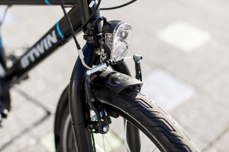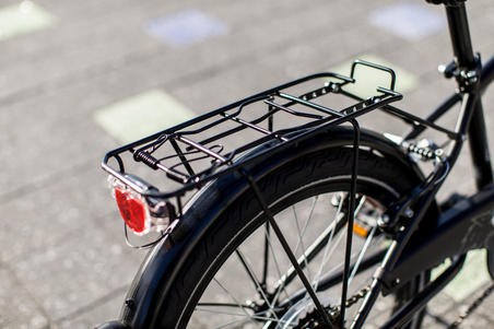 Pour vous déplacer toute l'année, de jour comme de nuit, nous avons équipé ce vélo ville 20 pouces de gardes boue, d'un éclairage LED à dynamo, de pneus à bandes réfléchissantes et d'un porte bagage.